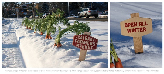 Ideální způsob, jak aktivovat naše chuťové buňky a propagovat jednoduché sdělení, že farmářský trh má otevřeno i v té nejmrazivější kanadské zimě: zapíchnout obrovské makety mrkve do sněhu. Agentura WAX, Calgary, Kanada