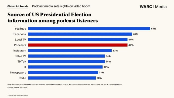 Podle Edison Research téměř polovina (44 %) dotázaných čerpalo své informace o amerických prezidentkách právě z podcastů, což bylo více než z kabelové televize (34 %) nebo sítě X (33 %).