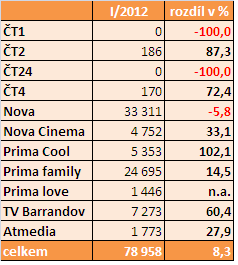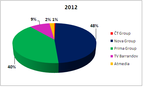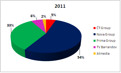 Pokud srovnáme počet dodaných GRP's v cílové skupině 15+, resp. TRP's pro 30vteřinové spoty v letošním lednu s obdobím ledna 2011, zjistíme, že silné komerční TV skupiny (Nova a Prima) si minimálně uchovaly svůj podíl z loňska (letos 88 %, vloni 87 %). Oproti loňsku ale v dodaných TRP's výrazně posílily kanály skupiny Prima, jejichž podíl se oproti loňskému lednu zvýšil na 40 %. Naopak podíl kanálů Novy ve stejném období klesl o 6 procentních bodů na 48 %.