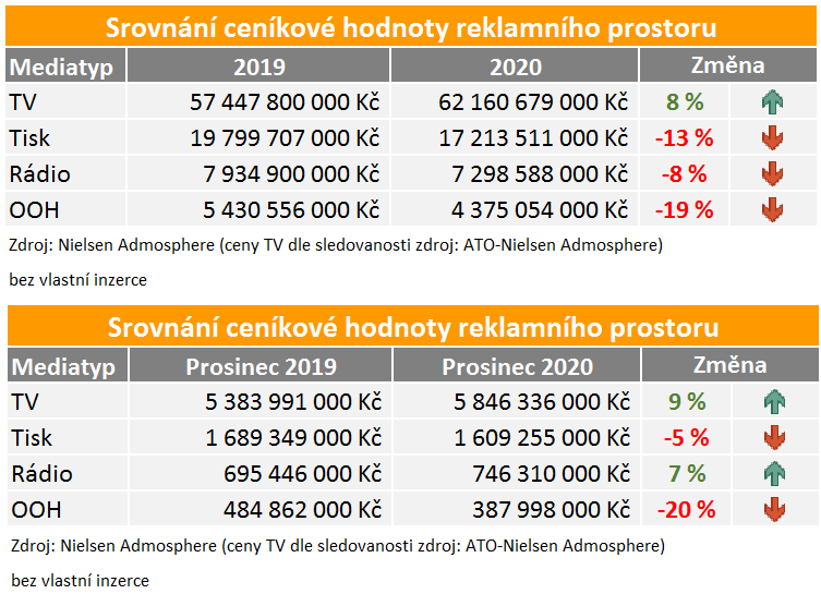 I přes pandemii covid-19 vykázal v roce 2020 český mediální trh s reklamou 3% růst. Jde o hrubé monitorované investice (ceníkové ceny inzerce). Na mírném růstu měly podíl především televizní reklama a internet. Venkovní reklama, tištěná média a rádiová reklama loni klesaly. Ukazují do data z monitoringu reklamy Ad Intel společnosti Nielsen Admosphere.