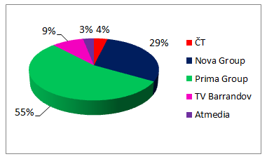 Podíl televizních skupin podle reklamních TRPs zůstal i v únoru podobný lednovému výsledku. Skupina Prima zaznamenala i v letošním druhém měsíci nejvyšší podíl na televizním trhu podle objemu reklamních TRPs. Oproti lednu se tak situace v rozložení reklamní komunikace na tuzemských komerčních televizích příliš nezměnila – došlo jen k mírnému posunu (Nova Group +2 procentní body, Prima Group -1 procentní bod).