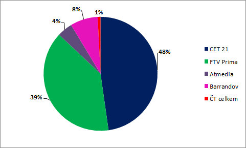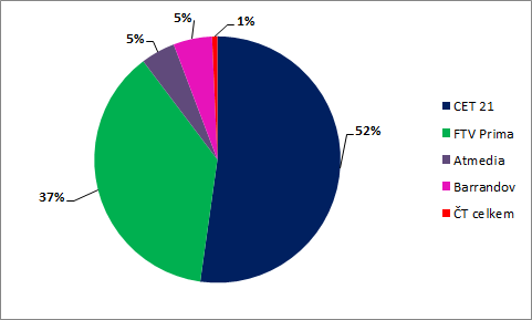 Z pohledu prodej televizní reklamy je pak ve skupině 15+ rozložení sil vyrovnané – na jedné straně CET 21 s podílem 48 %, na druhé straně stanice Media Clubu (Prima, Barrandov) s podílem 47 %. Do příštího roku se jejich podíl mírně zvýší i o stanici Óčko. V mladší skupině 15-54 má ale stále nejsilnější podíl CET 21.