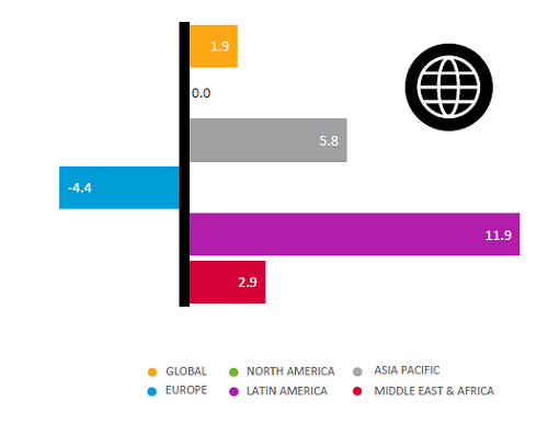V prvním čtvrtletí 2013 došlo celosvětově na reklamních trzích v meziročním srovnání k nárůstu o 1,9 % na celkových 77 mld. USD. Podstatná část růst se ale týká Jižní Ameriky, zatímco největší reklamní trhy v Severní Americe a v Evropě buď stagnují (Severní Amerika 0 %), nebo klesají (v evropském regionu pokles o 4,4 %) – viz graf.