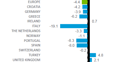 Jak ukazuje bližší pohled na aktivitu v jednotlivých evropských zemích, objem reklamních investic je značně ovlivňován ekonomickými problémy především v jižní Evropě. Nejvyšší meziroční pokles – téměř 20 % – připadá na Itálii. K hranici 10procentního poklesu se blíží Španělsko a Portugalsko. Mírně poklesl i silný německý trh (-4 %), naopak ve Velké Británii se investice meziročně zvýšily o 2 %.