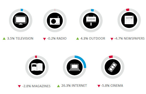 Nejsilnějším reklamním médiem stále zůstává televize (celkový podíl na reklamním trhu 59 %). Podle zprávy Adview Pulse se navíc nezdá, že by postavení televize jako mediatypu mělo být do budoucna výrazněji ohroženo. Přesto se ale i televize dotkl na reklamním trhu v Evropě pokles investic, a to o téměř 3 % ve srovnání s posledním čtvrtletím 2012. Objem tiskové reklamy se stále mírně snižuje jak v novinách (-2,8 %), tak v časopisech (-4,7 %). Naopak růst internetu pokračuje, v prvním čtvrtletí 2013 představoval 26 %.
