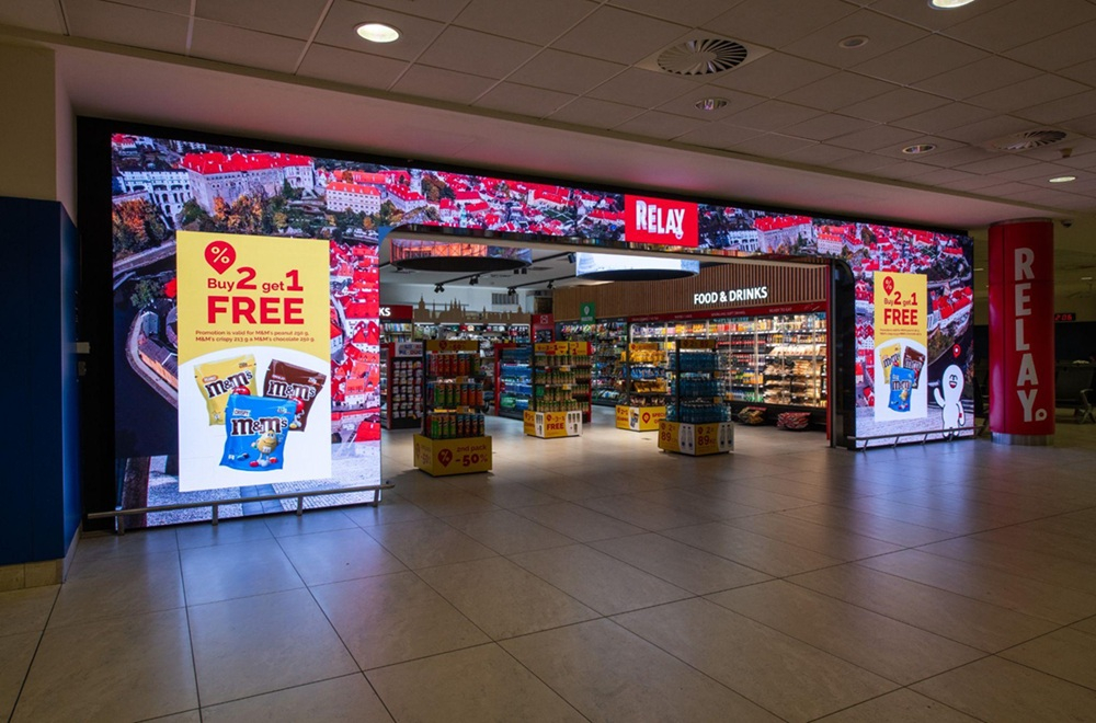 Způsob, jak v takovém prostředí vyniknout, hledali v Relay společně s agenturou BlueTouch Media ve své pobočce na Letišti Václava Havla. Výsledkem jejich spolupráce je velkoformátový LED shopfront: digitální vitrína široká deset metrů a vysoká tři metry, složená ze tří obrazovek, které tvoří jeden souvislý obraz.