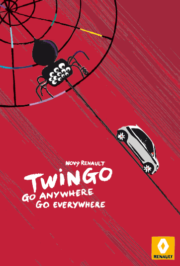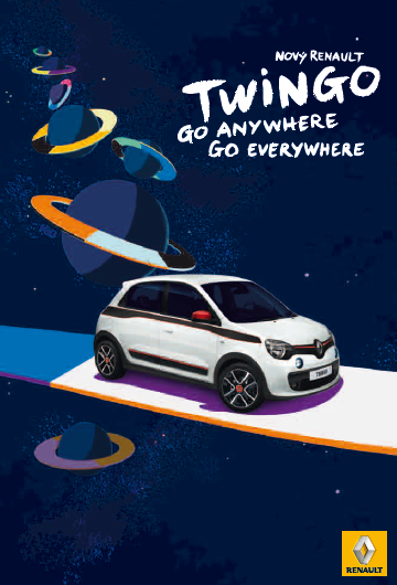 Automobilka Renault komunikuje od 7. září svůj nový model městského automobilu Twingo, s jehož inovací přichází dvacet let po jeho premiéře. Barevná ilustrovaná kampaň se sloganem „Go anywhere, go everywhere“ podtrhuje svým stylem hlavní rysy automobilu – jeho manévrovatelnost, hravost a barevnost.