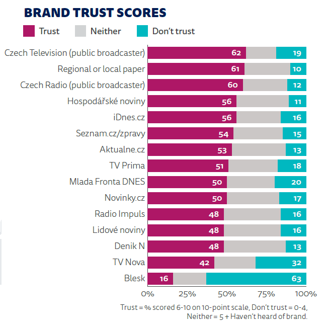 Důvěra české populace ve zpravodajství se podle aktualizované studie Reuters Institutu pohybuje na úrovni 33 %. Je to stejný výsledek jako před rokem. Nejvyšší důvěru má podle studie opět Česká televize, následují lokální a regionální tituly a Český rozhlas.