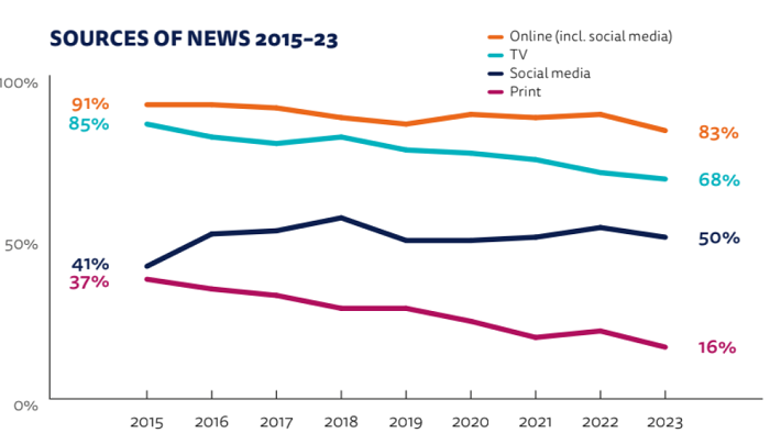 Internet včetně sociálních médií zůstává v Česku hlavním zdrojem, ze kterého získávají lidé zpravodajské informace. Podle letošní zprávy Digital News Report 2023 od Reuters Institute se zprávy přes internet a sociální média dostávají k 83 % české populace. Oproti loňskému zjištění jde ale o pokles o pět procentních bodů. Podle výzkumu se snížilo také získávání zpráv z dalších zdrojů: z televize (letos 68 %, což je meziroční pokles o dva procentní body ), jen ze sociálních médií (50 %, což je pokles o tři procentní body), a na své nejnižší číslo se v měření Reuters Institute dostala tištěná média (16 %, což je meziročně o pět procentních bodů méně).