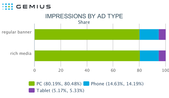 Podle zprávy došlo v mnoha státech k nárůstu popularity multimediálních reklamních formátů (video, audio a animace). Největší podíl rich media formátů byl zaznamenán na Ukrajině (46,4%) a v České republice (45,6 %), naopak nejnižší v Lotyšsku (15,8 %). Na Slovensku obsahuje rich media více než pětina kampaní. Investice do multimediálních formátů mohou také zvýšit počet klikání na reklamy – na všech analyzovaných trzích je míra prokliku u tohoto typu reklamy vyšší než u klasických bannerů. Roste rovněž podíl kliknutí z mobilních zařízení, nárůst byl zaznamenán především u smartphonů.