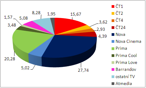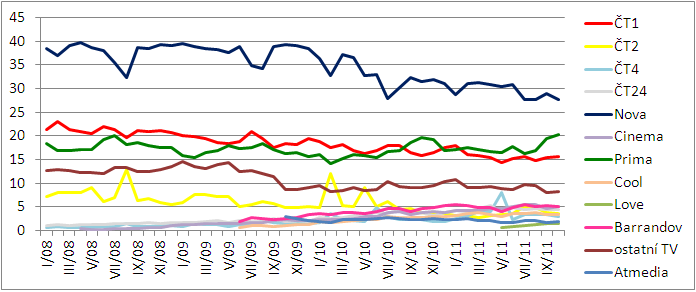 Zajímavý je pak pohled na vývoj televizní sledovanosti od roku 2008. Ukazuje se, že nástup digitalizace nepřinesl významné změny, pokud jde o počet hráčů, kteří mají dominantní postavení na televizním trhu. Stále je totiž hlavní divácký zájem – i díky zavedeným novým kanálům – rozprostřen mezi trojici Nova, Česká televize, Prima. Přesto je vidět, že za uvedenou dobu oslabily zejména hlavní kanály České televize (ČT1) a vlajkový kanál TV Nova.