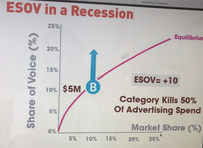 I přes horší vnější podmínky ale doporučuje Ritson neustávat v marketingové komunikaci, a to právě především v době recese. Za klíčový ukazatel považuje hodnotu ESOV (excess share of voice), která vyjadřuje rozdíl mezi podílem na sledovanosti komunikace (SOV) a podílem na trhu (SOM). Pokud zadavatelé neustávají v komunikaci, mohou si díky tomu zvýšit svůj podíl na trhu. „Sníží-li ostatní značky v kategorii investice o 50 % a naše značka investice ponechá, má to pozitivní dopad na nárůst podílu na trhu," popsal Ritson. Na modelovém příkladu ukázal, že při zachování stávajících investic a při snížení investic ostatních značek o polovinu, představuje navýšení tržního podílu deset procentních bodů.