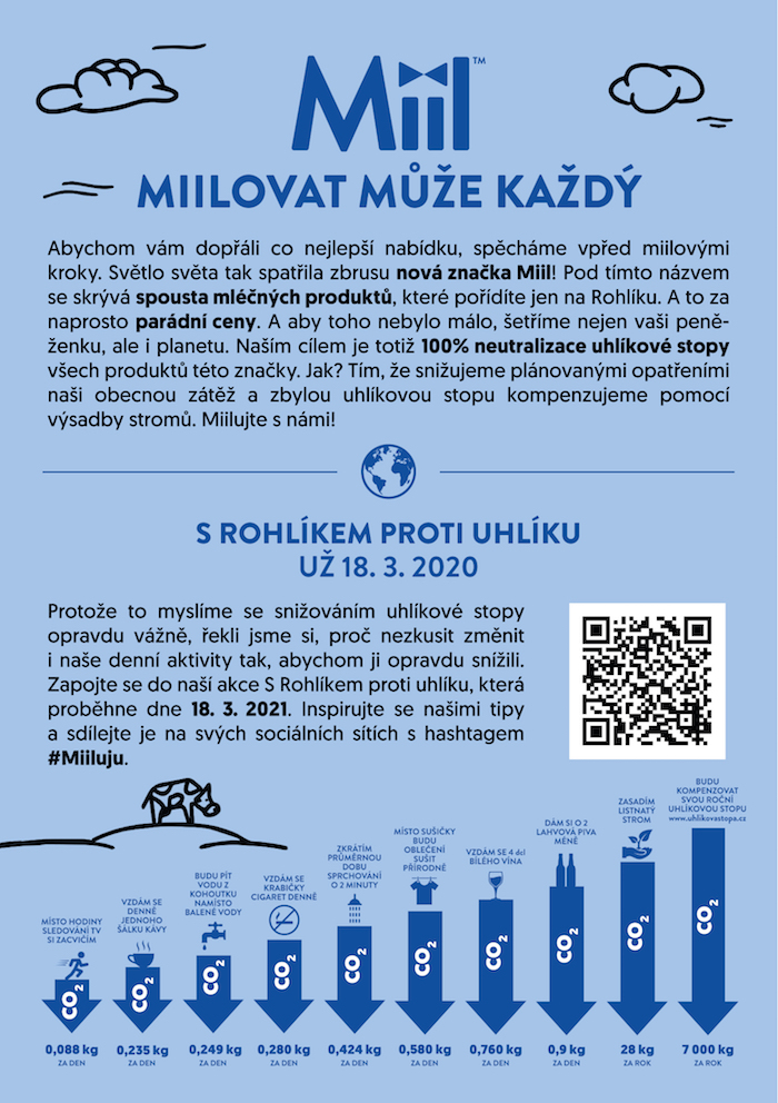 Při vzniku nové značky Miil hrála podstatnou roli transparentnost. Cílem byla 100% neutralizace uhlíkové stopy. „Stále přemýšlíme, jak kromě našich zákazníků udělat radost i planetě. A Miil v tomhle ohledu není výjimkou. Uvědomujeme si, že obecně všechny produkty zatěžují životní prostředí. Ale to neznamená, že s tím nebudeme něco dělat. Naším cílem je proto 100% neutralizace této uhlíkové stopy. Tím, že snižujeme plánovanými opatřeními naši obecnou zátěž a zbylou uhlíkovou stopu kompenzujeme pomocí výsadby stromů,“ představuje ambici nové značky Olin Novák, komerční ředitel Rohlík Group.
