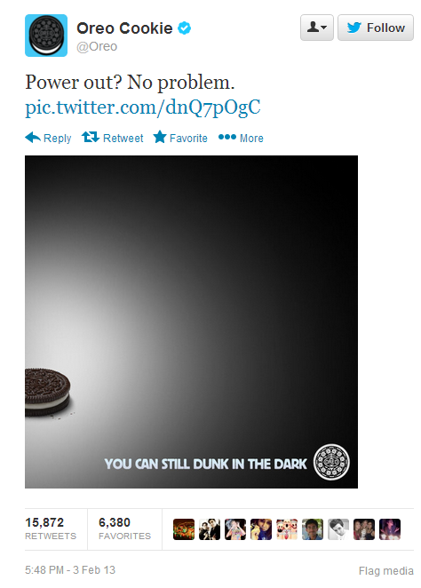 Další událostí, která rozpohybovala vody světového Twitteru, bylo červnové finále NBA a únorové finále americké fotbalové ligy zvané Super Bowl, které se svým hashtagem #SB47 vygeneroval na 24,1 milionů tweetů. Letošní nepříjemný výpadek elektrického proudu proměnila ve svůj prospěch značka Oreo tweetem, který dosáhl téměř 16 tisíců retweetů.