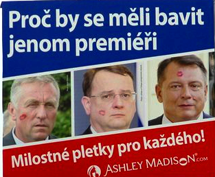Společnost zaměřená na diskrétní seznamování zadaných využila fotografie bývalých českých premiérů, kteří dříve řešili problémy s nevěrou. Pod nápisem "Proč by se měli bavit jenom premiéři" na billboardech umístila fotografie Mirka Topolánka, Petra Nečase a Jiřího Paroubka. Podle Rady pro reklamu jde o zjevný případ porušení pravidla kodexu, které konstatuje, že "reklama nesmí ke svému působení využívat nositele veřejné autority (například politiky, představitele odborných medicínských a jiných společností), i když by oni sami se svým úplatným či bezúplatným působením v reklamě souhlasili". Porušeno bylo prý také pravidlo, že "reklama nesmí zobrazovat žádné žijící osoby a ani na žádné žijící osoby nijak odkazovat v případě, že s tím tyto osoby předem výslovně nesouhlasí".