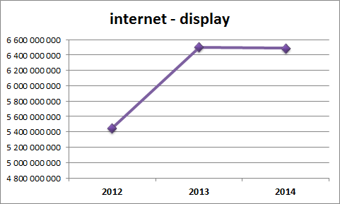 Celkový objem ceníkového prostoru internetové display reklamy dosáhl v loňském roce 6,5 mld. Kč, což bylo o 0,2 % méně než v roce 2013. Vyplývá to z monitoringu společnosti Admosphere, která sleduje hrubé investice směřované do nákupu reklamního prostoru. Růst internetové display reklamy se tak v loňském roce zastavil. Ještě v roce 2013 registroval monitoring inzerce meziroční růst na úrovni 19 %.