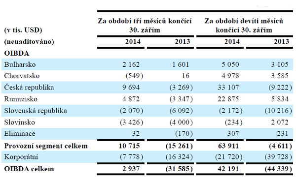Provozní výsledek před odpisy a amortizací (OIBDA) se v Česku ve třetím čtvrtletí vrátil do zisku 9,7 mil. USD (cca 202 mil. Kč) a za celé období devíti měsíců dosáhl v Česku výše 33,107 mil. USD (cca 672 mil. Kč).