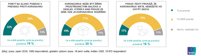 Na vybrané informace kolující o koronaviru se Ipsos zeptal české veřejnosti a porovnal je s výsledky mezinárodního výzkumu Ipsos realizovaného v 16 zemích světa. Češi častěji než jiné národy věří, že pobyt na slunci pomáhá v prevenci proti koronaviru – za pravdivou informaci ji považuje 32 % Čechů, ve světě jen 19 %.
