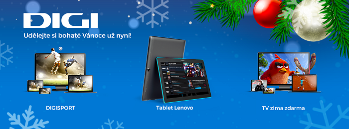 Televizní operátor Digi TV láká před Vánoci nové zákazníky na možnost získání tabletu Lenovo, nebo tříměsíčního sledování Digi TV zadarmo, případně zpřístupnění sportovních kanálů Digi Sport na půl roku zcela zdarma. Jako bonus nové zákazníky upozorňuje také na to, že si předplacením Digi TV „vyřeší“ problém s přechodem na vysílání v novém standardu DVB-T2.
