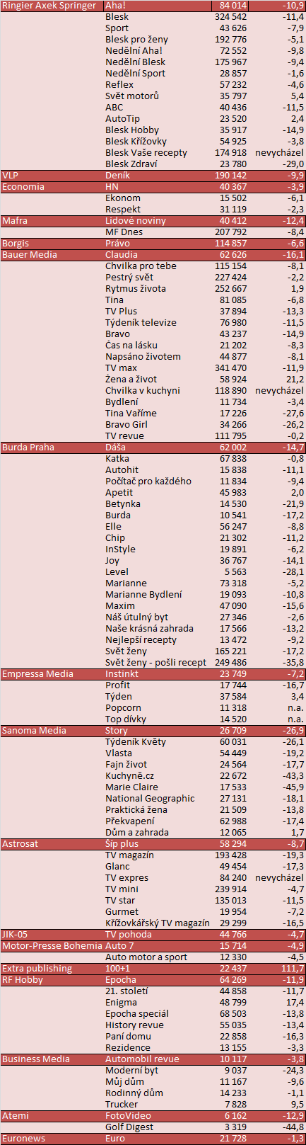 Pozn.: Tituly vydavatelství Mladá fronta a Stratosféra nejsou auditovány ABC ČR, proto v přehledu nejsou uvedeny.