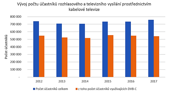 Ve sledovaném období celkový počet uživatelů kabelové televize do roku 2015 mírně klesal, poté zaznamenal mírný růst. Celkový počet v roce 2017 činil 757 tis., což představuje oproti roku 2012 nárůst na úroveň 102 %. Meziroční nárůst v roce 2017 u celkového počtu účastníků činil 3 %, a to i přes skutečnost, že počet uživatelů využívajících služby digitálního kabelového TV vysílání (DVB-C) meziročně poklesly o 4,1 % na 541 tis. přípojek a činí tak 71 % celkových přípojek. Počet účastníků využívajících DVB-C v roce 2017 poklesl oproti roku 2012 na úroveň 98,7 %