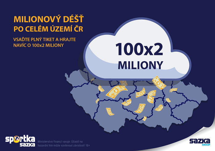 Společnost Sazka spustila kampaň Milionový déšť. Českým sázkařům slibuje, že během následujících dvou měsíců nadělí stu z nich dva miliony korun.