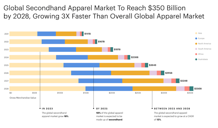 Ze zmíněného Resale Reportu vyplývá, že prodej módy z druhé roky rostl loni 15x rychleji než zbytek oděvního sektoru. Do roku 2028 by měl secondhand dosáhnout hodnoty 350 miliard dolarů a poroste 6,4x rychleji než zbytek trhu.