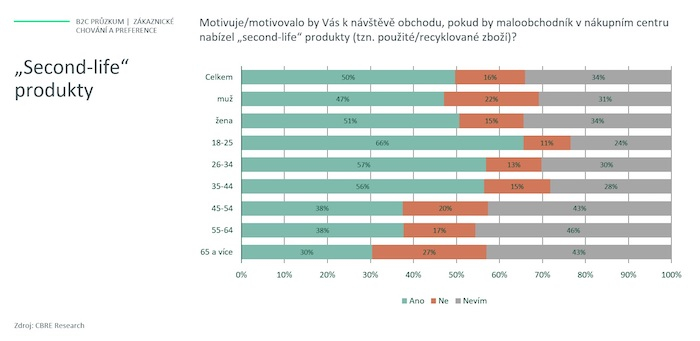 „Výsledky průzkumu ukázaly, že polovinu respondentů by nabídka takových produktů potenciálně motivovala k návštěvě obchodu v nákupním centru. Nejvíce mladé lidi ve věku od 18 do 25 let, ale nadprůměrně si vedly i kategorie od 26 do 44 let. Potenciální zájem byl deklarován především o oblečení, což zmínilo 86 % dotázaných. Další relativně vysoce hodnocenou byla kategorie knihy, hračky a (video)hry, a hned poté kategorie nábytku, sportovního vybavení a také elektroniky,“ komentuje za společnost CBRE Aleš Nečas, vedoucí oddělení maloobchodních pronájmů.