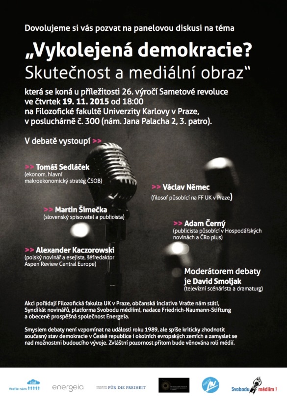 Filozofická fakulta UK v Praze, občanská inciativa Vraťte nám stát!, Syndikát novinářů, platforma Svobodu médiím! a nadace Friedrich-Naumann-Stiftung pořádají panelovou diskusi na téma „Vykolejená demokracie? – Skutečnost a mediální obraz,“ která se koná u příležitosti 26. výročí Sametové revoluce.