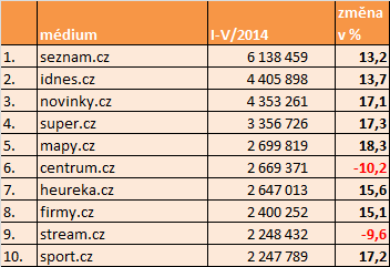 Příliš se ani nemění pořadí nejsilnějších médií. Z první pětice nejrychleji rostou Mapy.cz, které letos prošly změnami. Největší média – Seznam.cz a iDnes.cz – zvýšily oproti loňsku návštěvnost shodně o 13-14 %. Daří se rovněž všem serverům, které pro Seznam.cz připravuje redakce Borgisu – Novinky.cz, Super.cz i Sport.cz letos zaznamenávají 17% nárůst návštěvnosti. Naopak z top serverů klesají Centrum.cz a Stream.cz.