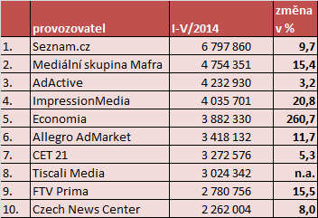 Nejsilnějším provozovatelům českého internetu se stále daří zvyšovat průměrnou měsíční návštěvnost, ukazují data výzkumu NetMonitor za prvních pět letošních měsíců ve srovnání se stejným loňským obdobím. Jednička tuzemského internetu, Seznam.cz, si podle dat udržuje i v letošním roce odstup dvou milionů reálných uživatelů od mediální skupiny Mafra.