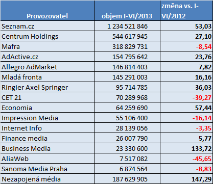 Pod největší internetové provozovatele jsou tak koncentrovány stále větší reklamní objemy. To menším hráčům ztěžuje pozici, aby si mohli sáhnout na významnější investice, které do bannerové online reklamy směřují. Ve srovnání s loňským prvním pololetím se monitorovaný objem Seznam.cz meziročně navýšil o více než 50 %, Centrum Holdings o téměř 30 %. Na pět největších provozovatelů podle objemu monitorované display reklamy tak v pololetí připadalo téměř 80 % veškerých monitorovaných výdajů (konkrétně 78 %), zatímco loni v prvním pololetí to bylo 72 %.