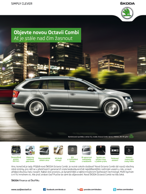 Od 3. května společnost Škoda podpoří svůj nový model Octavia Combi rozsáhlou integrovanou kampaní, jejíž intenzivní část poběží v průběhu května. Představení nového modelu bude částečně provázáno s komunikací sponzoringu IIHF Mistrovství světa v ledním hokeji, které se bude konat od 3. do 19. května.