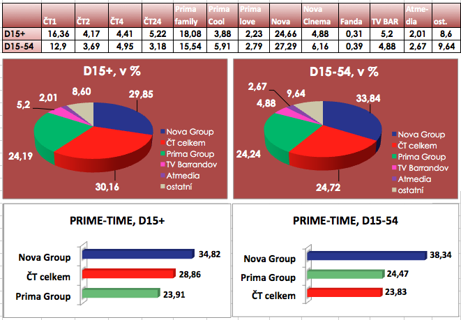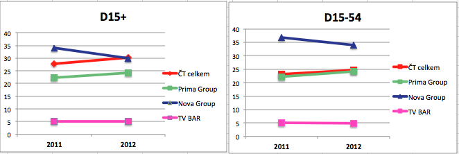 V mladší skupině 15-54 je Nova i přes snížení podílu (-3) nejsilnější skupinou. Oproti roku 2011 si díky tematickým kanálům Prima Love a Prima Cool v této cílové skupině nejvíce polepšila Prima Group (+2). Nejvyššího podílu v hlavním vysílacím čase dosáhla vloni v obou cílových skupinách Nova Group.