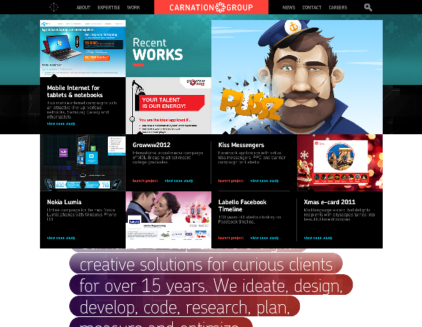 Zajímavý web má i maďarská reklamní agentura Carnation Group. Kombinaci skrolování a funce „drag and drop“ posuďte sami.
