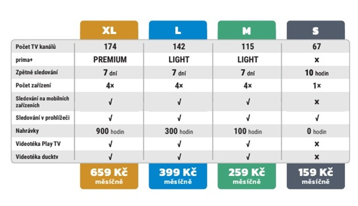 Změnou prošla i celá nabídka televizní služby. Uživatelé si nyní mohou vybrat mezi čtyřmi hlavními balíčky s označením S (159 Kč měsíčně), M (259 Kč), L (399 Kč) a XL (659 Kč). Na první tři měsíce mohou získat noví zákazníci zmíněnou 25% slevu. Uvedené balíčky lze dále rozšířit o tři doplňkové tematické balíčky: HBO a Max (229 Kč), Sport (179 Kč), Pro dospělé (179 Kč). K balíčkům je také možné sledování obsahu Prima bez reklam za 69 Kč měsíčně.