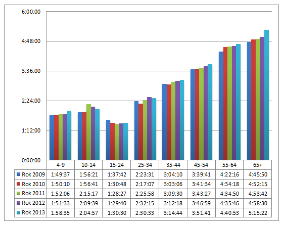 Sledování televize věnují čeští diváci stále více času. Ve věkové skupině 4+ se čas strávený u televize za posledních pět let – od roku 2009 – prodloužil o více než 18 minut. Největší nárůst byl zaznamenán u diváků nad 65 let, kteří v roce 2013 sledovali televizi průměrně 5 hodin a 15 minut denně, což je téměř o půl hodiny více než před pěti lety.