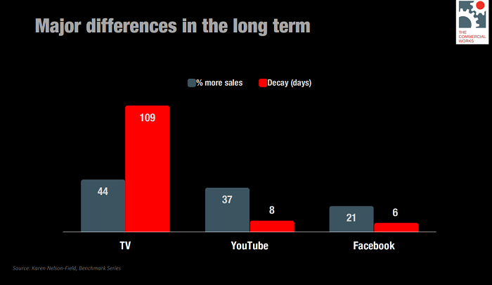 Ohledně reache (zásahu) Snijders konstatoval, že masová média, zejména televize, jsou vhodným nástrojem k oslovování zákazníků situovaných v levé části výše popsaného schématu. Živá televizní sledovanost je v porovnání s dalšími typy sledování (odložená TV sledovanost, streaming, online video) stále nejvyužívanějším typem sledování (v Nizozemí v r. 2018 představovala živá TV 2:05 hod průměrného sledování, zatímco odložená sledovanost 25 minut a streaming 26 minut). Navíc efekt televizní reklamy má být po jejím odvysílání delší ve srovnání s reklamou na Facebooku a YouTubu. Tzv. decay effect (odeznívání účinků reklamy po jejím odvysílání) má být v televizi asi čtnáctkrát pomalejší než na Facebooku a Youtube, přičemž televizní reklama má zároveň v dlouhodobém horizontu generovat z těchto tří médií nejvyšší procento nákupů. V současném multikanálovém prostředí bývá rovněž zvykem zvyšovat počet kanálů, a tím dosahovat požadovaného reache, podle Snijderse může být ale tento přístup nákladný.