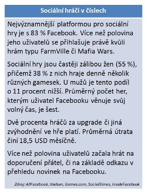 Stavění měst, pěstování zeleniny či mafiánské přestřelky jsou na Facebooku a jemu podobných záležitostí natolik oblíbenou, že publikum sociálních her svou velikostí v USA poprvé předčilo většinu primetimových pořadů tamních televizí. A na rozdíl od nich, díky zvyšujícímu se počtu uživatelů sociálních sítí, neustále roste.