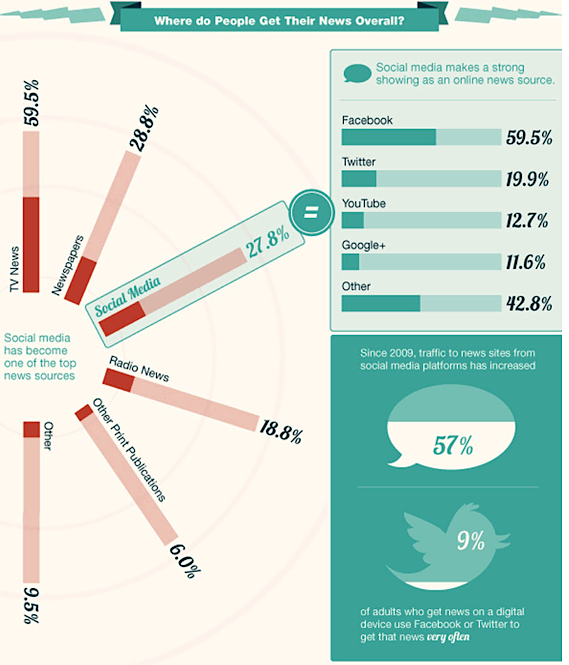 S nástupem mobilní technologie a s expanzí sociálních sítí pak dochází k tomu, že sociální média začínají sloužit jako primární zdroje dění o svém okolí. Podle zmíněné infografiky jsou v americké veřejnosti sociální média s 27,8 % třetím nejdůležitějším zdrojem informací po televizi (59,5 %) a novinách (28,8 %), tedy před rádiem (18,8 %) nebo jinými tištěnými zdroji (6 %). Jednoznačně nejsilnějším zdrojem informací z jednotlivých sociálních médií má být Facebook (59,5 %) před Twitterem (19,9 %) a YouTube (12,7 %).