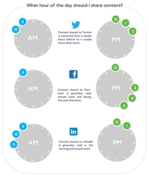 Další otázkou je, kdy je nevhodnější status na dané sociální síti publikovat. Nejdříve si lidé konzultují LinkedIn, před polednem a kolem poledne přichází na řadu Twitter a kolem oběda a pak v pozdějším odpoledni si lidé rádi projdou Facebook.