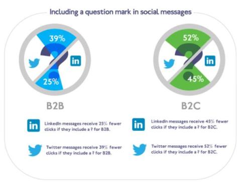 Rozdíl nastává i v oblasti interpunkčních znamének. Na zprávu, která obsahuje otazník, kliknou podle zjištění společnosti Compedium uživatelé sociálních sítí výrazně méně než na zprávu bez otazníku, v B2C je proklikovost nižší než v B2B komunikaci. Například na LinkedInu proklikne zprávu s otazníkem o 25 % méně lidí v B2B komunikaci a o 45 % méně v B2C. Na Twitteru reaguje na tázací zprávu v B2B o 39 % méně lidí a v B2C o 52 %.