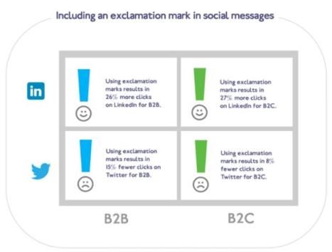 Naopak vykřičník se v komunikaci vyplácí, alespoň tedy na LinkedInu, a to jak v B2B komunikaci, kde přináší o 26 % více kliků, tak v B2C komunikaci, kde je počet kliků jen o málo vyšší (27 %). Jinak se k vykřičníku chovají lidé na Twitteru, kde se pozoruje spíše pokles prokliků – o 15 % méně v B2B, o 8 % v B2C komunikaci.