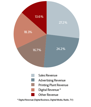 Nějvětší část tržeb pochází z prodeje titulů (27 %), inzertní prodej tvoří 24 %, tiskárny necelých 17 % a digitální média více jak 18 %.