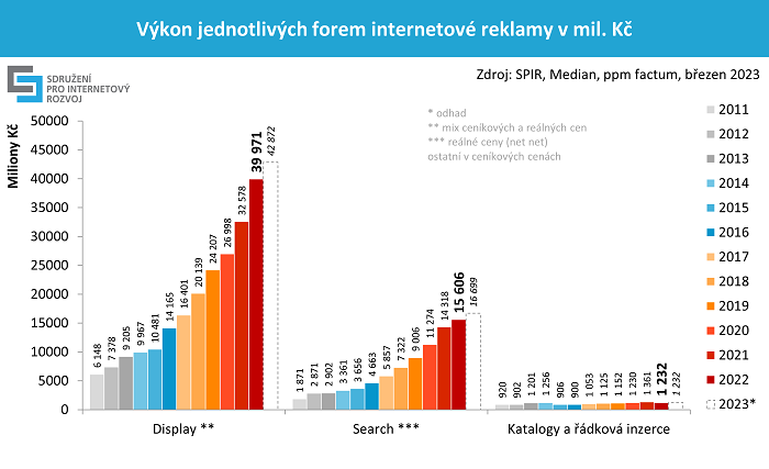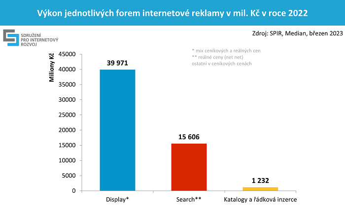 V roce 2022 dosáhly výdaje do online reklamy téměř 57 miliard korun, což bylo meziročně o 18 % víc. Jde o součet ceníkových a čistých cen. Na růstu se v absolutních hodnotách nejvíce podílela display reklama (+23 %) a reklama ve vyhledávání (+9 %). Z pohledu způsobu obchodování inzertního prostoru rostl programatický nákup display reklamy o 35 %. Očekávání pro rok 2023 je 7% růst investic do online reklamy na úrovni 60,8 mld. Kč. Údaje pocházejí z výzkumu inzertních výkonů internetové reklamy, který pro Sdružení pro internetový rozvoj (SPIR) realizuje agentura Median.