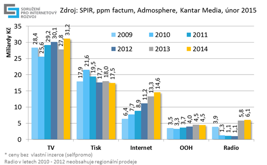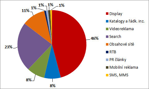 Reklama ve vyhledávání (Google AdWords, Seznam Sklik) pokračuje v nárůstu investic, za loňský rok dosáhla odhadovaného objemu 3,4 mld. Kč v reálných cenách, o téměř 500 mil. více než v roce předchozím. Objem reklamy prodávané v obsahových sítích představuje 1,6 mld. Kč v reálných cenách. Více než miliarda korun (1,3 mld. Kč) připadá na katalogovou a řádkovou inzerci. Stále více peněz zadavatelé směřují do video a mobilní reklamy na internetu. V posledních 4 letech (od roku 2011) vzrostl výkon videoreklamy trojnásobně na 907 mil. Kč a mobilní reklama čtyřnásobně na 153 mil. Kč (ceníkové ceny).