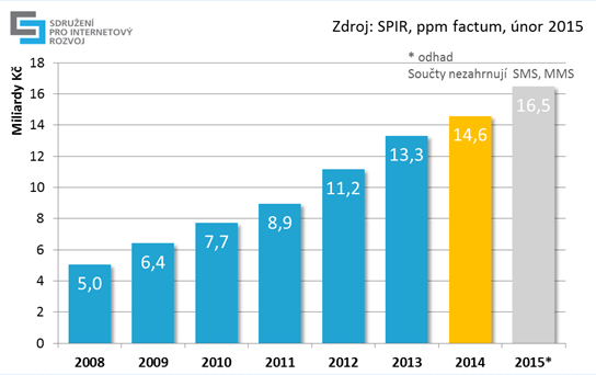 Objem internetové inzerce dosáhl v loňském roce podle odhadu profesního sdružení SPIR 14,6 miliard korun. Oproti roku 2013 to představuje 10% nárůst. Způsoben má být především zvýšenými investicemi do reklamy ve vyhledávání, bannerové display inzerce a videoreklamy.