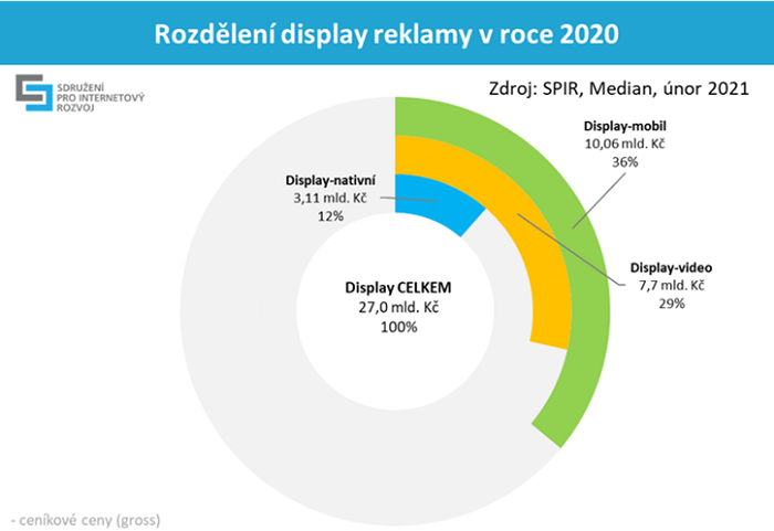 Objem výdajů do internetové inzerce dosáhl v roce 2020 téměř 40 miliard korun. Oproti roku 2019 jde o 15% nárůst, na kterém se v absolutních hodnotách nejvíce podílela display reklama (+12 %) a reklama ve vyhledávání (+25 %). Z pohledu způsobu obchodování inzertního prostoru rostl programatický nákup display reklamy o 8 %. Vyplývá to z průzkumu inzertního výkonu internetové reklamy, který pro Sdružení pro internetový rozvoj (SPIR) realizuje agentura Median. Údaje za ostatní mediatypy poskytla společnost Nielsen-Admosphere.