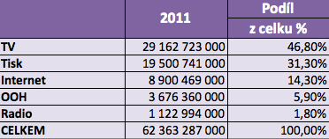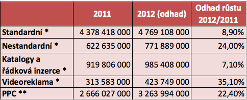 Investice do internetové reklamy v loňském roce dosáhly téměř 9 miliard Kč. Oproti roku 2010 to představovalo 15% nárůst. Nejoblíbenějšími formami zůstávají plošná (display) a výkonnostní reklama. Podíl internetu jako mediatypu přesáhl podle SPIR a Factum Invenio 14 % na celkových investicích do reklamy za rok 2011 u nás a je na třetím místě za televizí a tiskem.