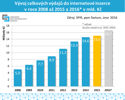 Účastníci výzkumu předpokládají, že online reklama v roce 2016 poroste o 11 % na 16,7 mld. Kč. V celkových reklamních výdajích připadá na online reklamu téměř pětinový podíl. Údaje pocházejí z průzkumu inzertního výkonu internetové reklamy, který pro Sdružení pro internetový rozvoj (SPIR) realizuje agentura ppm factum.